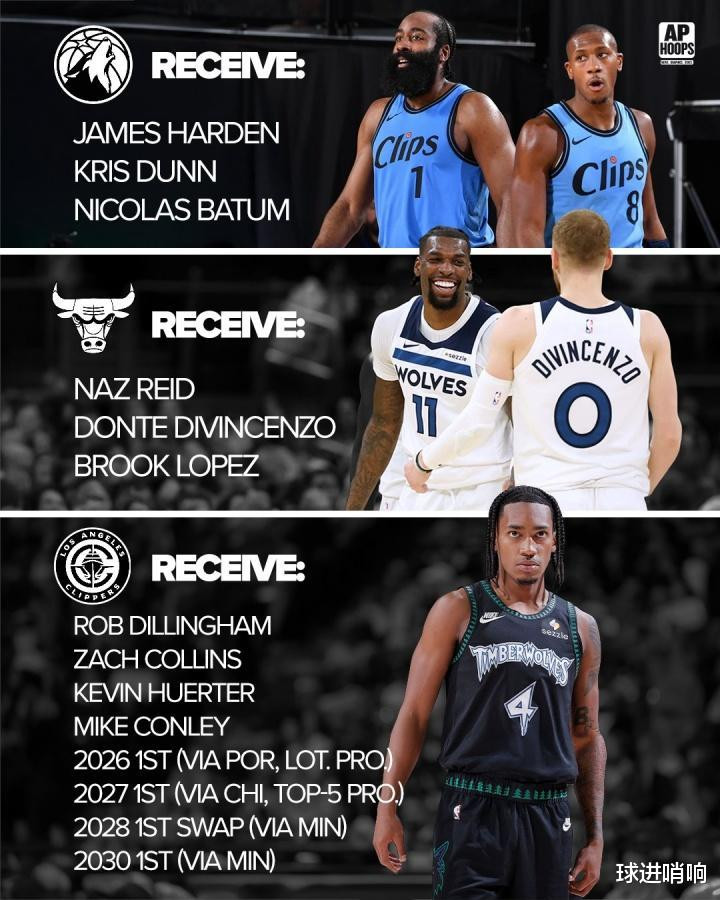 快船得到:迪林厄姆+扎克-科林斯+赫尔特+康利+26年开拓者首轮(来自公牛)+27年公牛前五保护首轮+28年森林狼首轮互换+30年森林狼首轮。